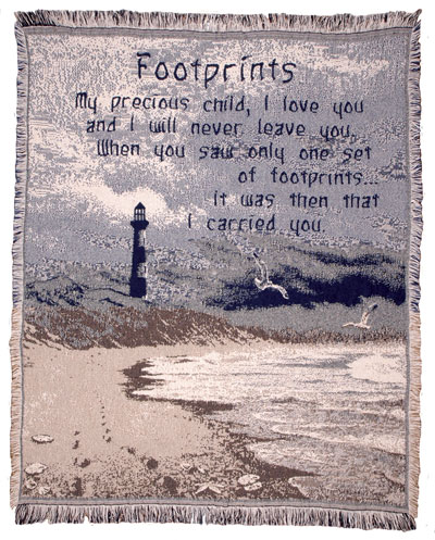 This 2 layer throw features a comforting message from the Lord, “I love you and I will never leave you. When you saw only one set of footprints it was then that I carried you.”