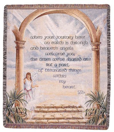 Throw features the words “When your journey here on earth is through and heaven’s angels welcome you, the time we’ve shared are but a part, of treasured things within my heart.” and features an angel standing beneath a golden arch with a sky full of clouds and sunbeams.